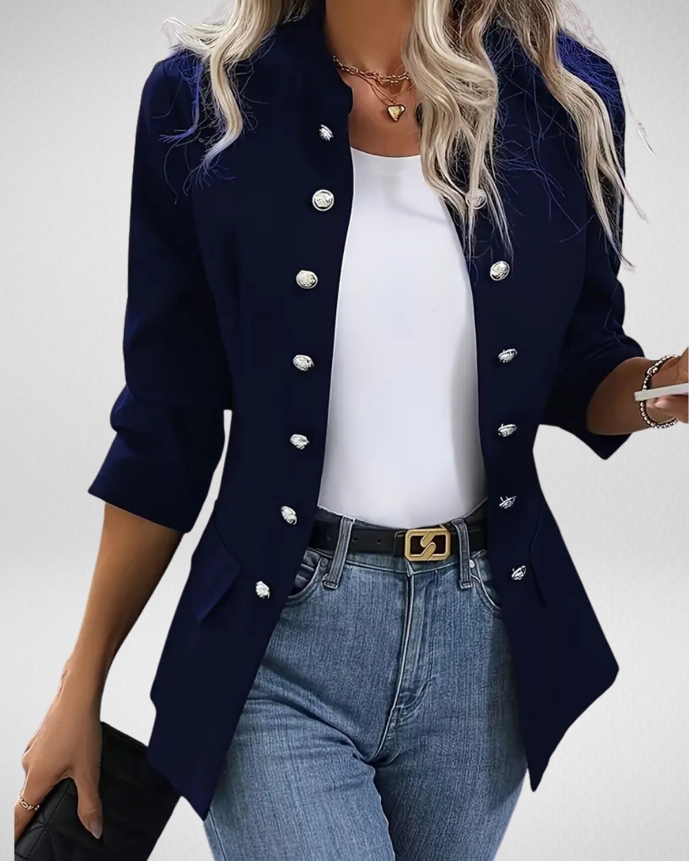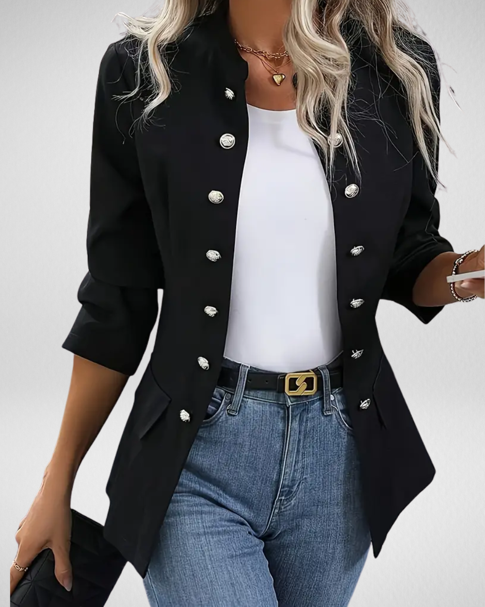 ダブル列のメタルボタン:装飾性と引き締め効果を両立した印象的なディテール。